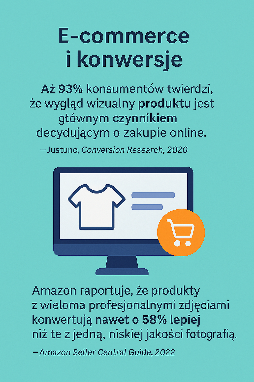 Amazon raportuje, że produkty z wieloma profesjonalnymi zdjęciami konwertują nawet o 58% lepiej niż te z jedną, niskiej jakości fotografią.